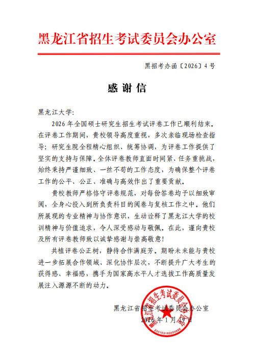 近日,我校收到黑龙江省招生考试委员会办公室发来的感谢信,信中对我校在 2026年全国硕士研究生招生考试评卷工作中的出色表现予以高度肯定,并向我校及全体参与评卷工作的教师致以诚挚感谢。